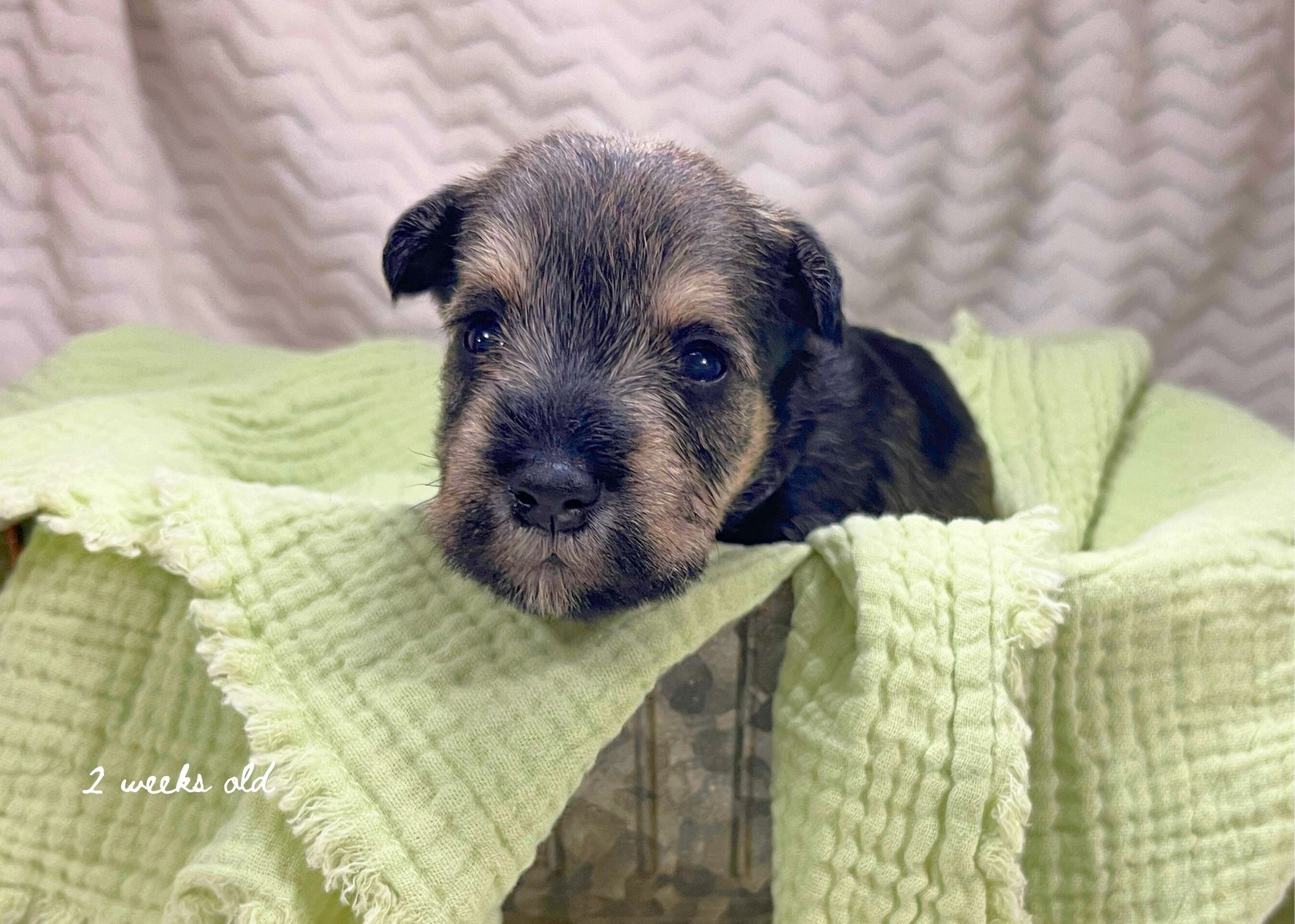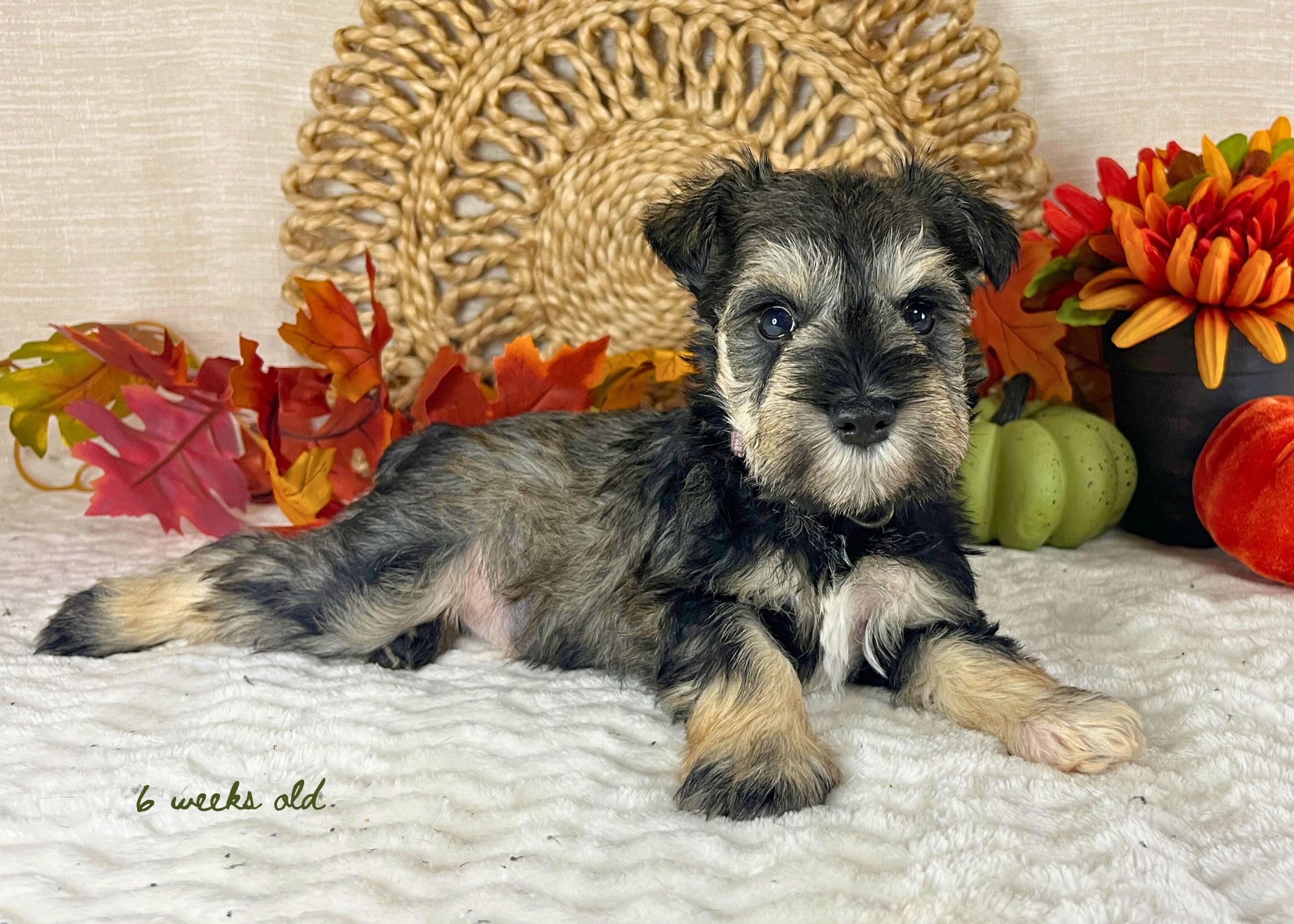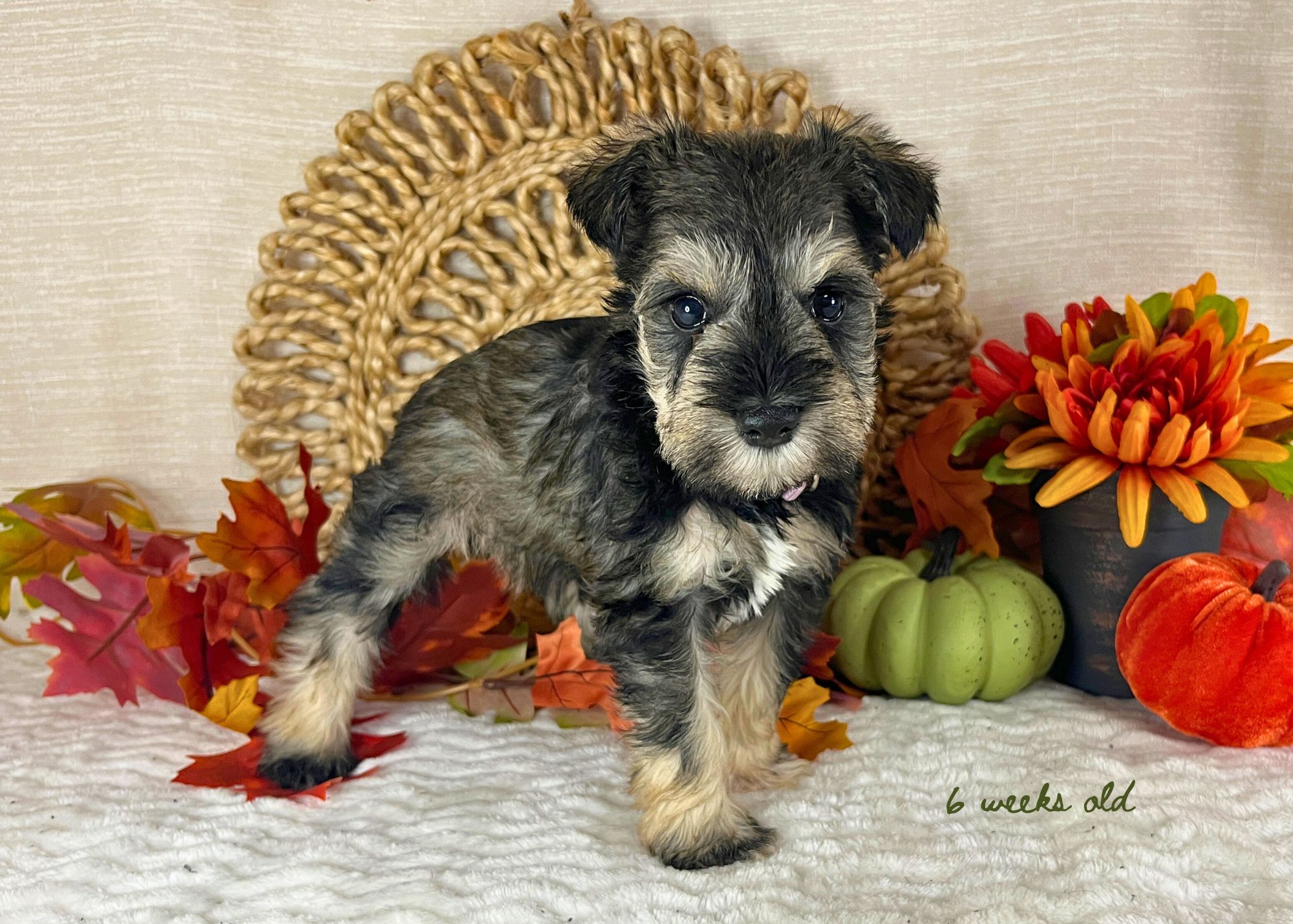 Miniature Schnauzers are a small friendly breed with an average height of 12 – 14″ and expected weight at maturity is 16 – 19 pounds. This loyal breed makes a very good family dog and they are also child friendly. Miniature Schnauzers are affectionate, loving and playful – making them great companions! The coat color of a Miniature Schnauzer is typically solid black or salt and pepper and they are a low shedding breed with distinctive bushy beard and eyebrows.