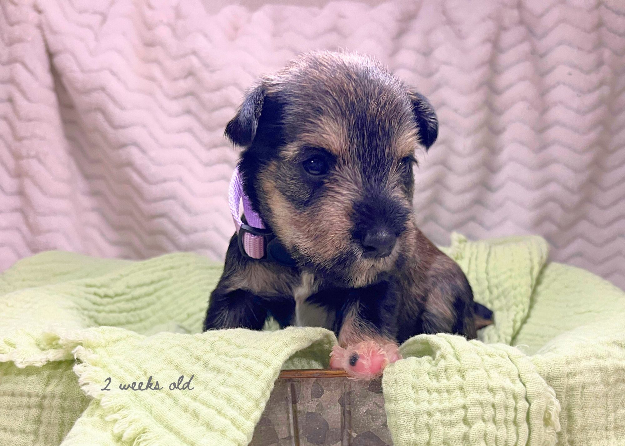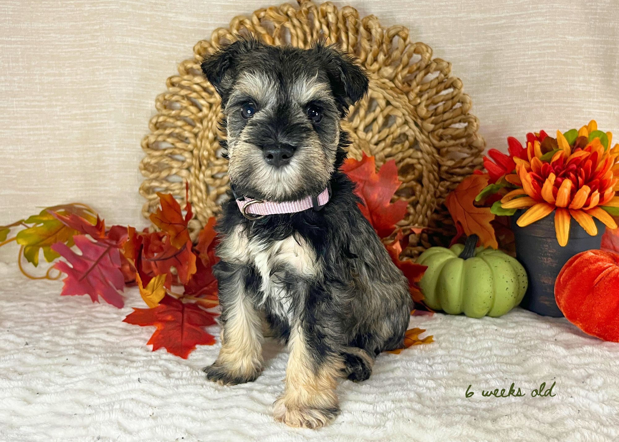Ginny was born on August 9th and she will be ready to go home around October 11, 2025! She has salt and pepper coloring. She loves attention and is bubbly and playful!