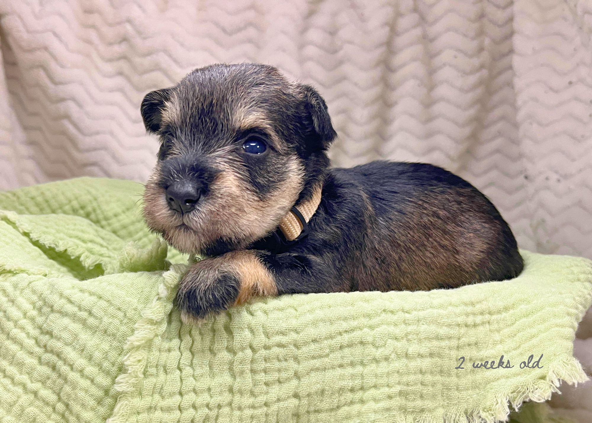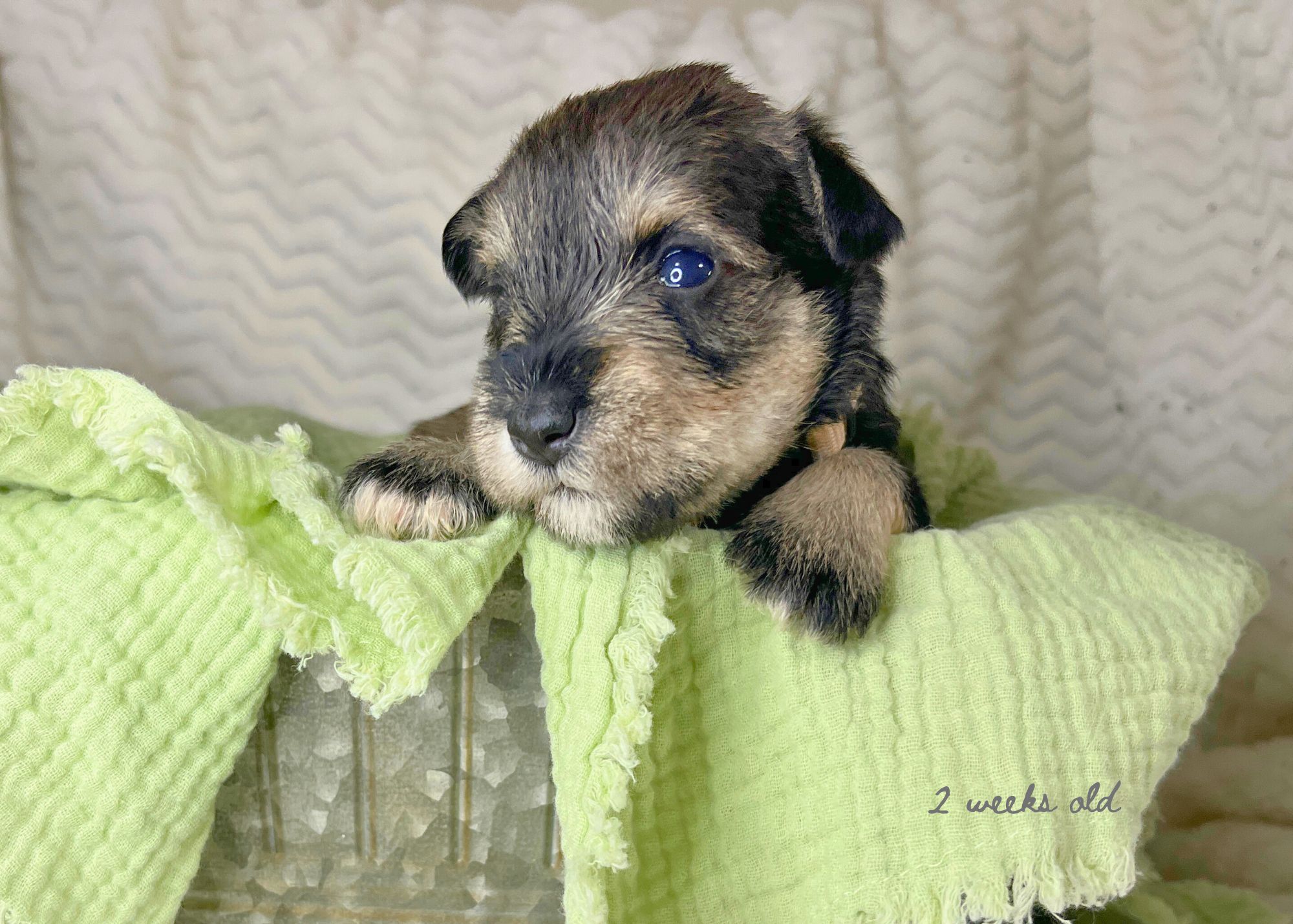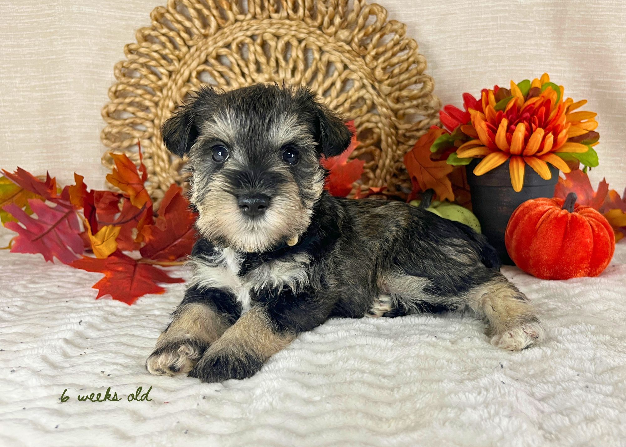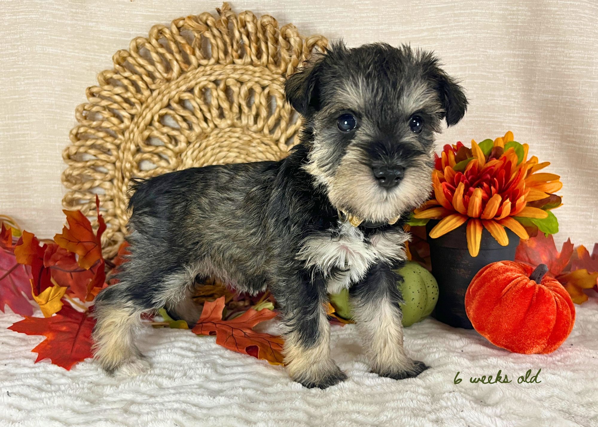 Miniature Schnauzers are a small friendly breed with an average height of 12 – 14″ and expected weight at maturity is 16 – 19 pounds. This loyal breed makes a very good family dog and they are also child friendly. Miniature Schnauzers are affectionate, loving and playful – making them great companions! The coat color of a Miniature Schnauzer is typically solid black or salt and pepper and they are a low shedding breed with distinctive bushy beard and eyebrows.