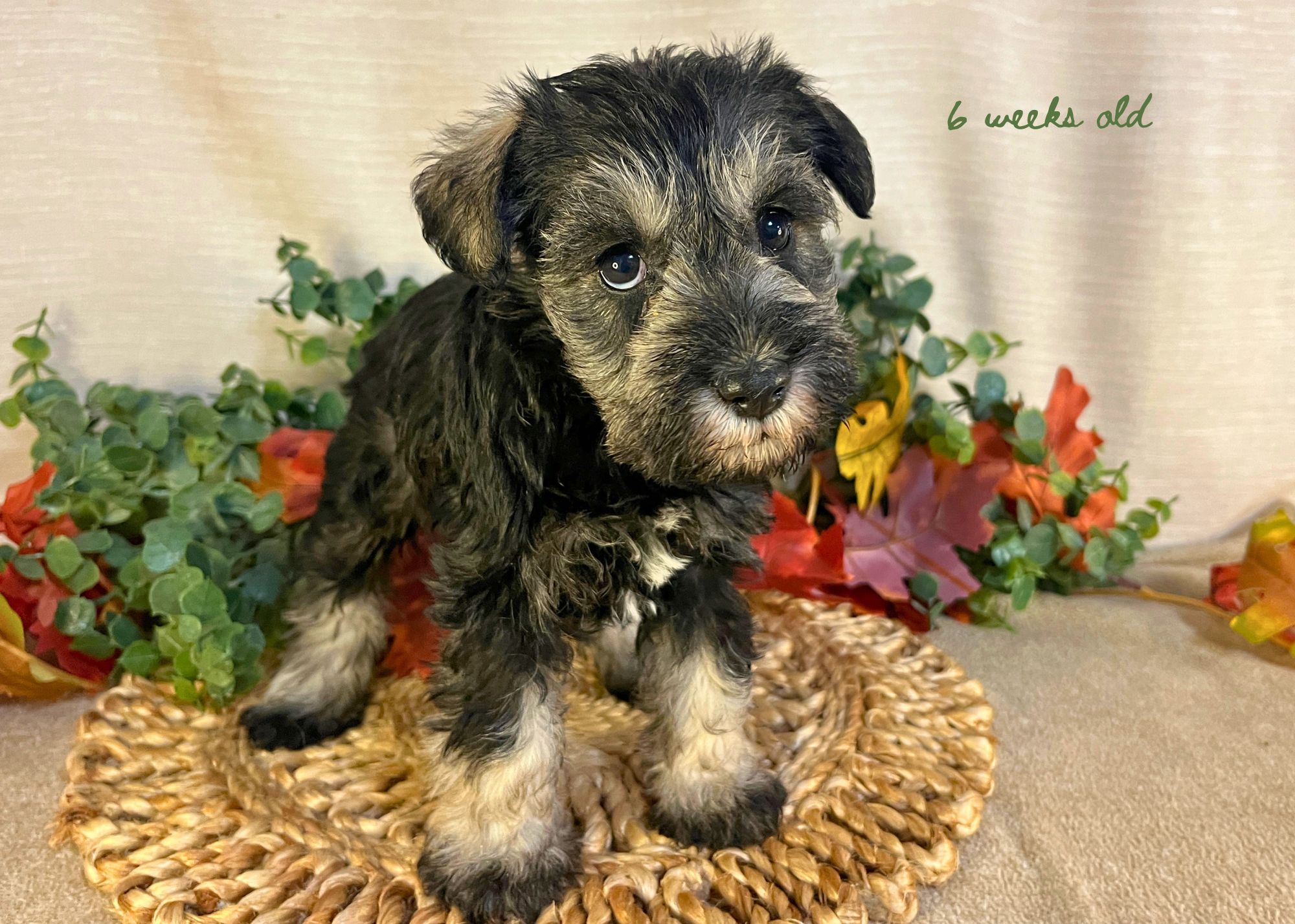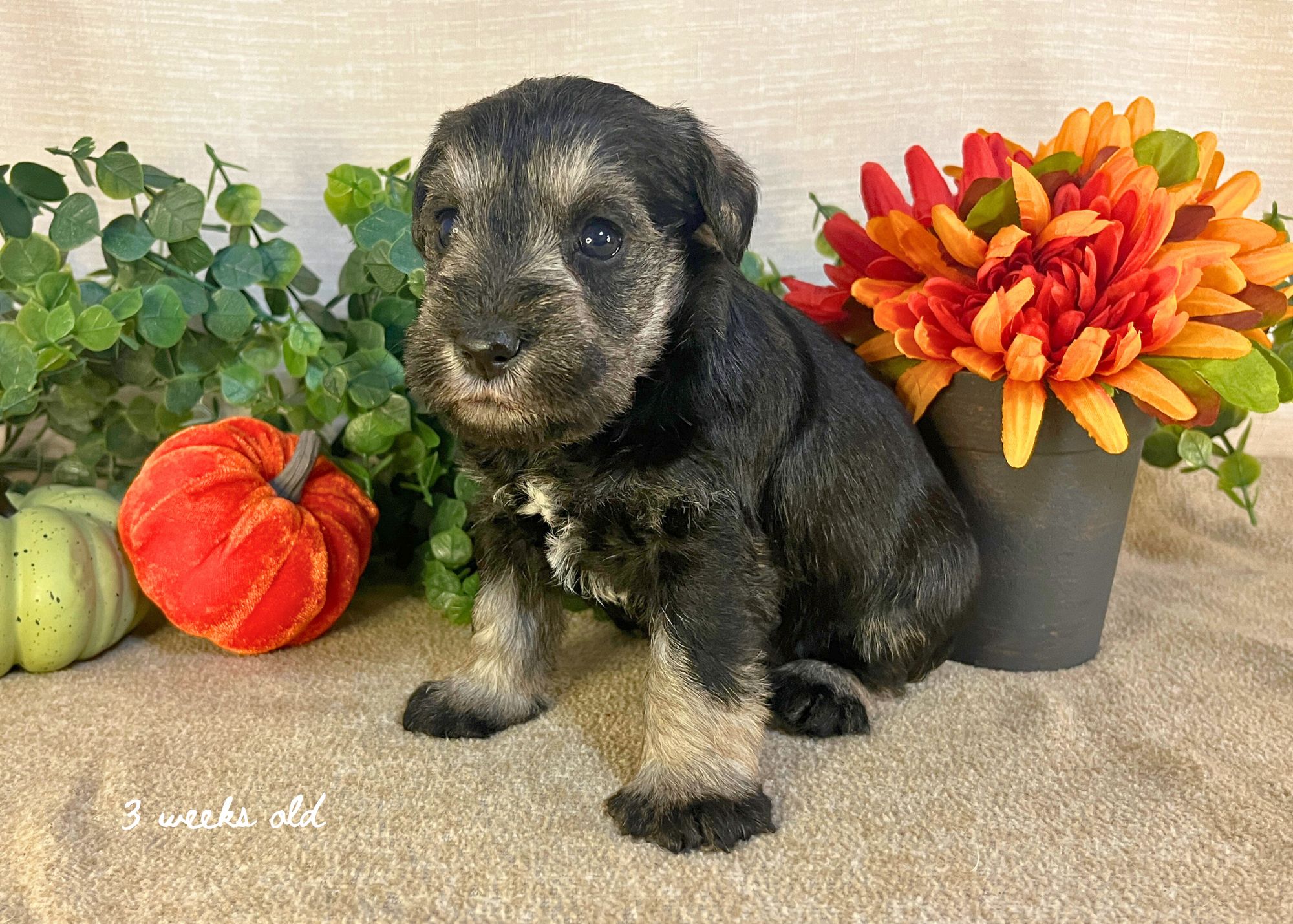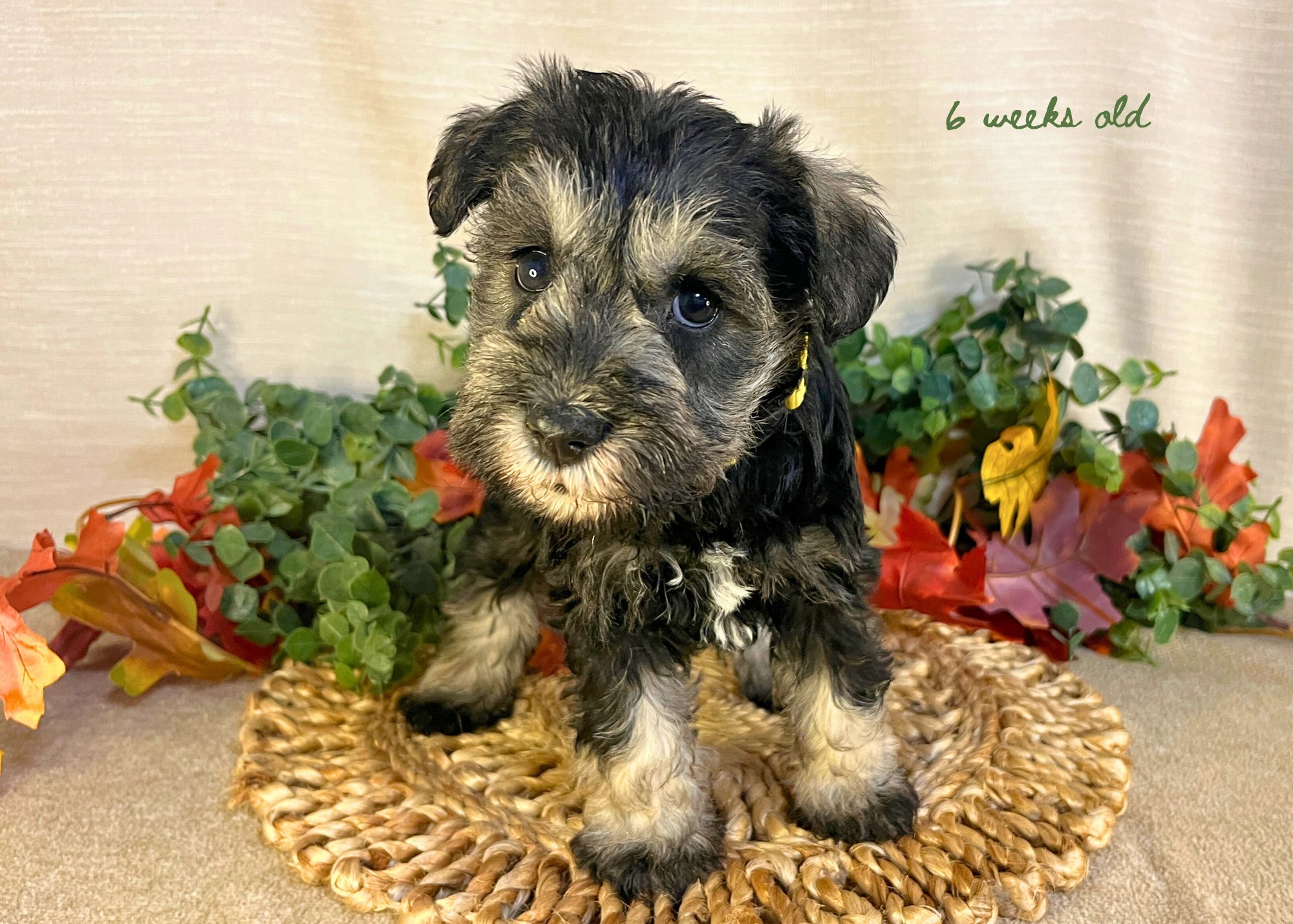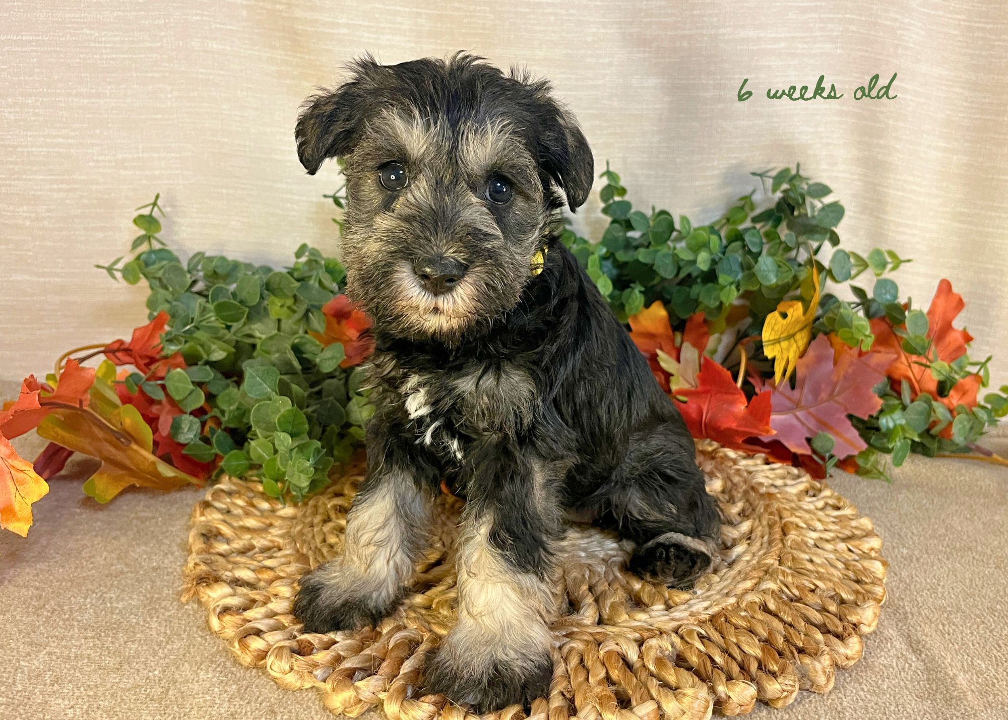 Miniature Schnauzers are a small friendly breed with an average height of 12 – 14″ and expected weight at maturity is 16 – 19 pounds. This loyal breed makes a very good family dog and they are also child friendly. Miniature Schnauzers are affectionate, loving and playful – making them great companions! The coat color of a Miniature Schnauzer is typically solid black or salt and pepper and they are a low shedding breed with distinctive bushy beard and eyebrows.