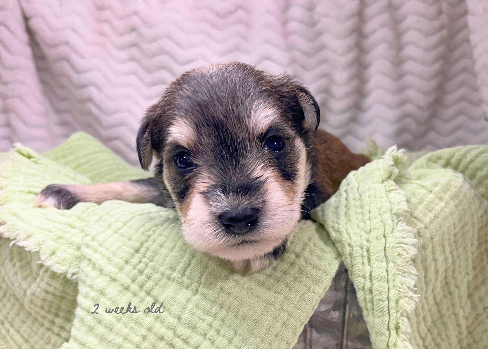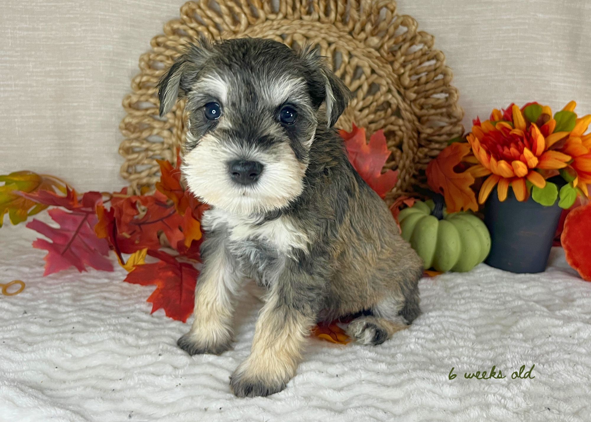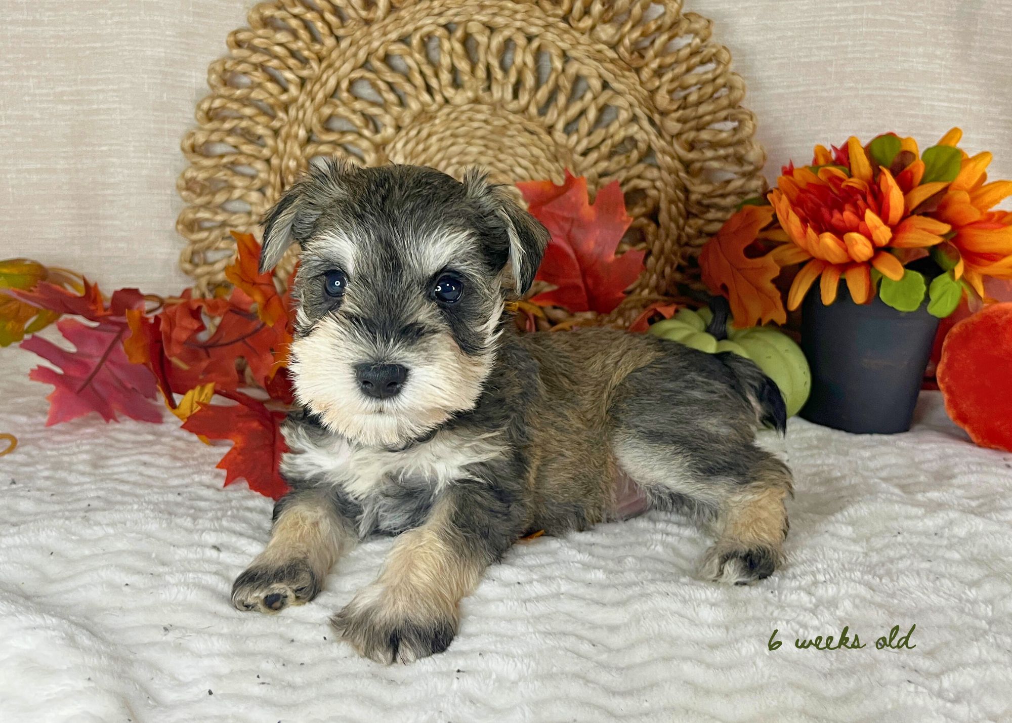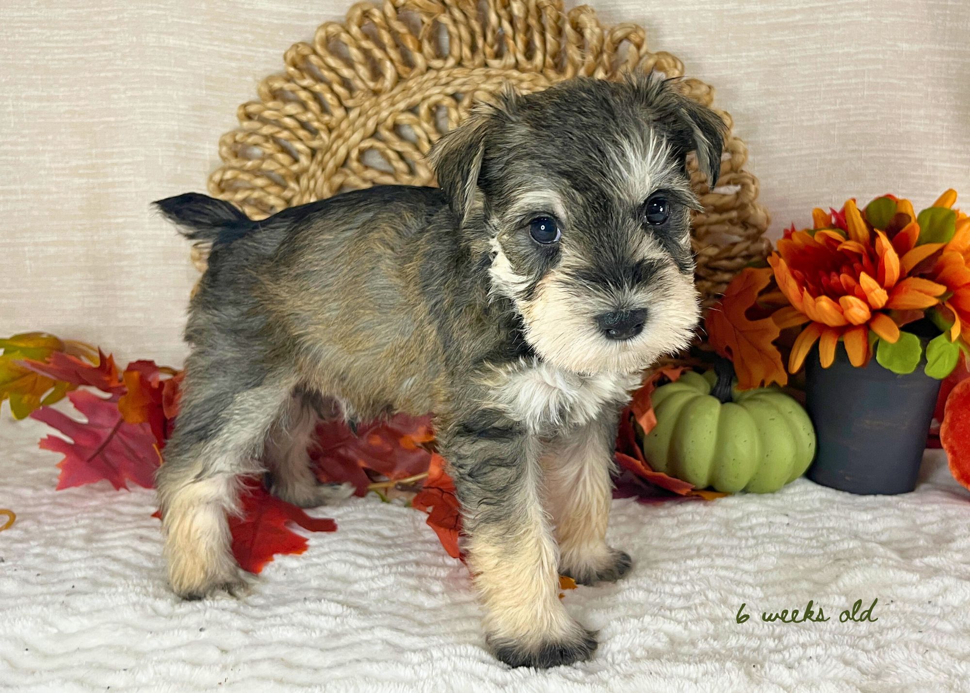 Miniature Schnauzers are a small friendly breed with an average height of 12 – 14″ and expected weight at maturity is 16 – 19 pounds. This loyal breed makes a very good family dog and they are also child friendly. Miniature Schnauzers are affectionate, loving and playful – making them great companions! The coat color of a Miniature Schnauzer is typically solid black or salt and pepper and they are a low shedding breed with distinctive bushy beard and eyebrows.