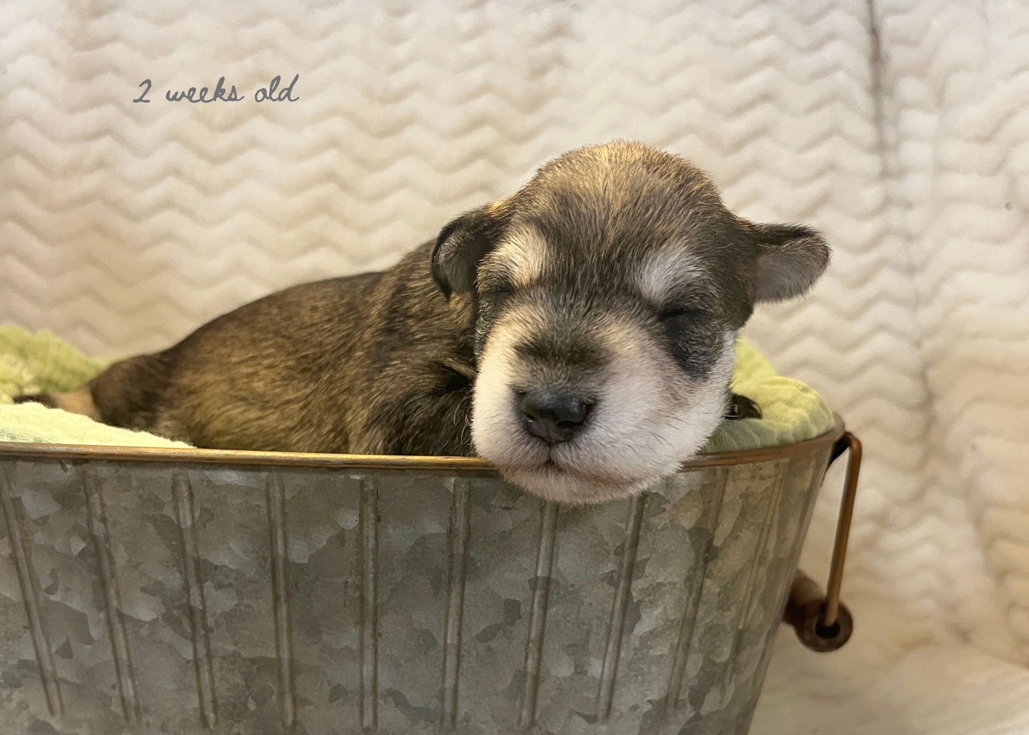 Nova was born on October 4 and she will be ready to go home around December 6, 2025! Her coloring is salt and pepper and we are expecting the puppies in this litter to be tenderhearted and attentive like Vivie’s previous litters!