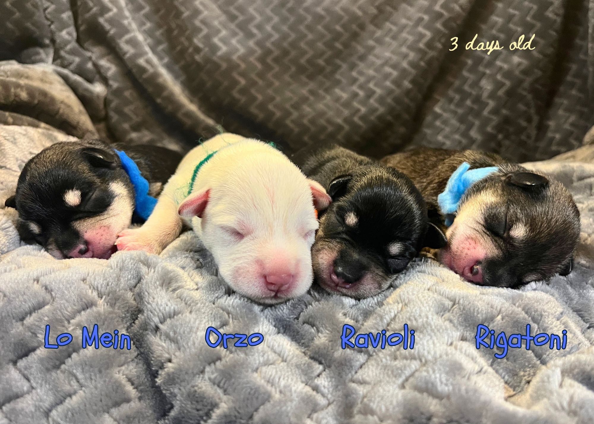 (Parents of the new litter, Flora and Ripley, are pictured to show coloring.)