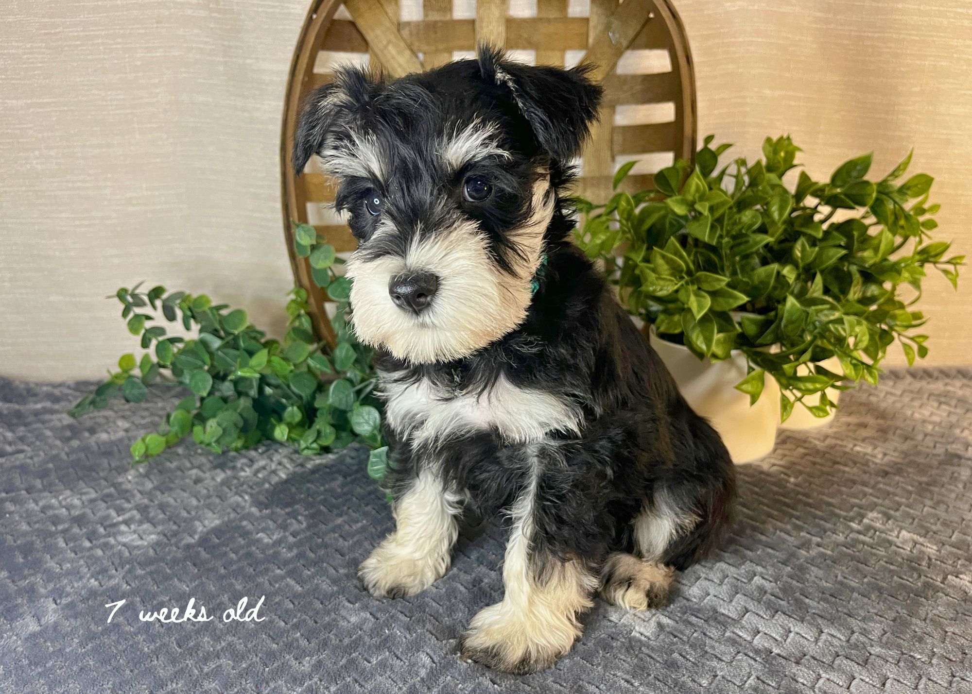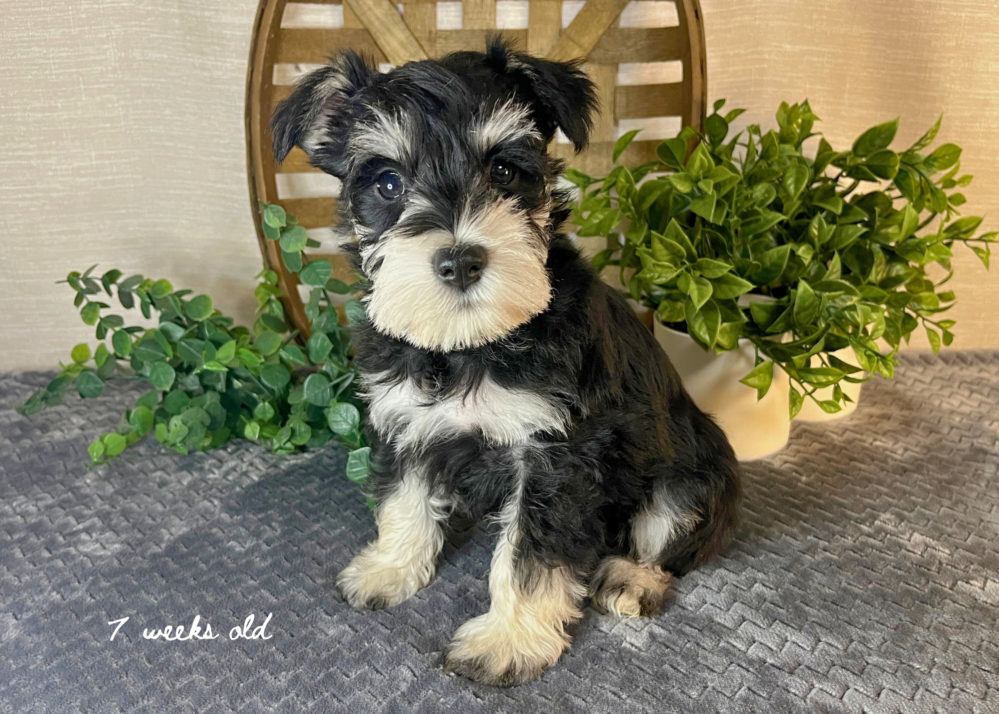 Miniature Schnauzers are a small friendly breed with an average height of 12 – 14″ and expected weight at maturity is 16 – 19 pounds. This loyal breed makes a very good family dog and they are also child friendly. Miniature Schnauzers are affectionate, loving and playful – making them great companions! The coat color of a Miniature Schnauzer is typically solid black or salt and pepper and they are a low shedding breed with distinctive bushy beard and eyebrows.