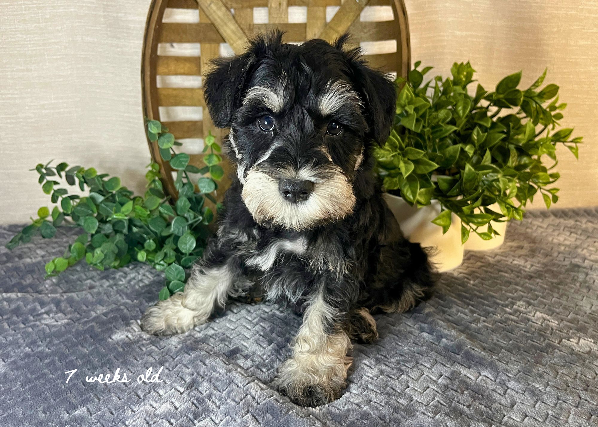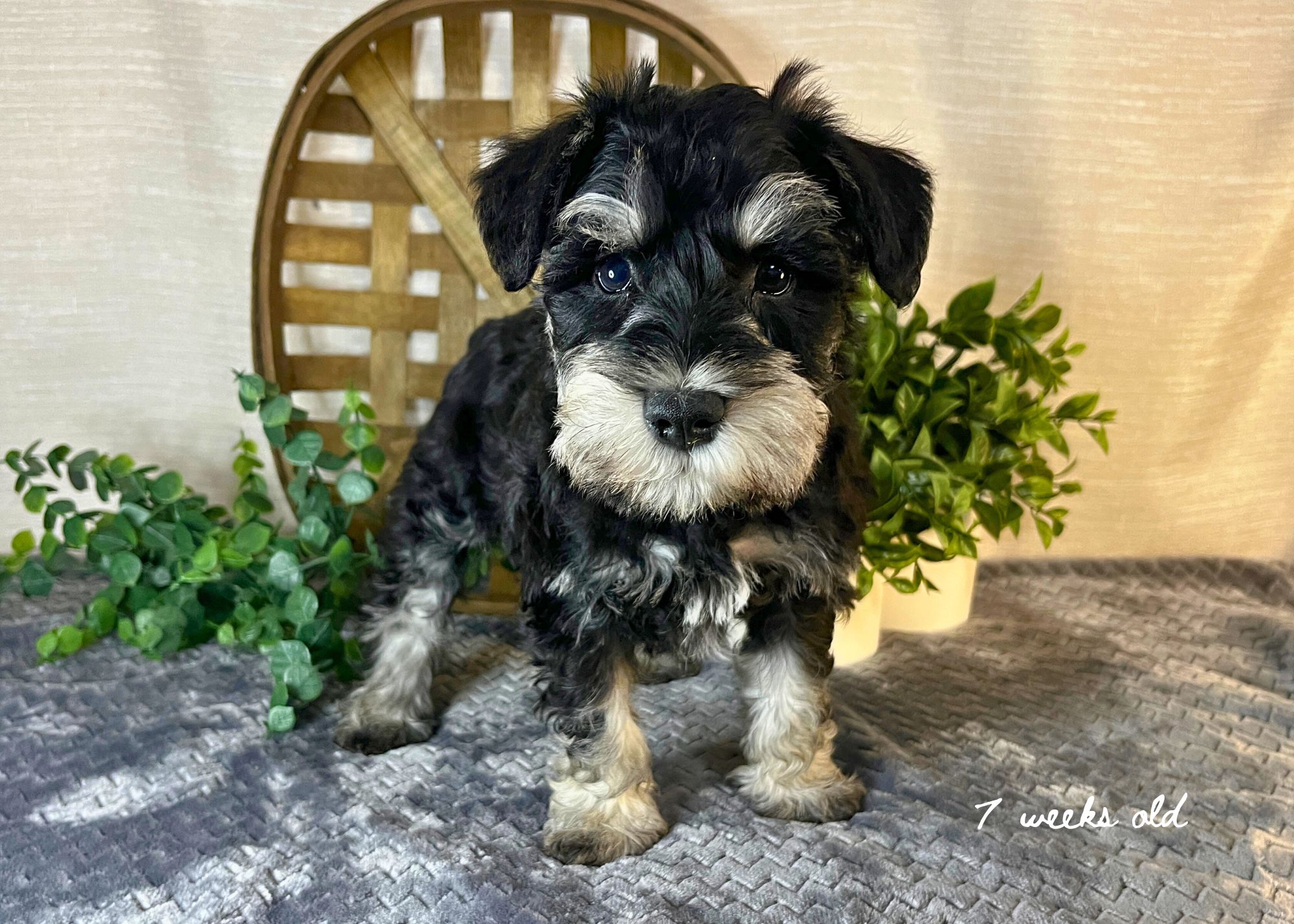 Miniature Schnauzers are a small friendly breed with an average height of 12 – 14″ and expected weight at maturity is 16 – 19 pounds. This loyal breed makes a very good family dog and they are also child friendly. Miniature Schnauzers are affectionate, loving and playful – making them great companions! The coat color of a Miniature Schnauzer is typically solid black or salt and pepper and they are a low shedding breed with distinctive bushy beard and eyebrows.