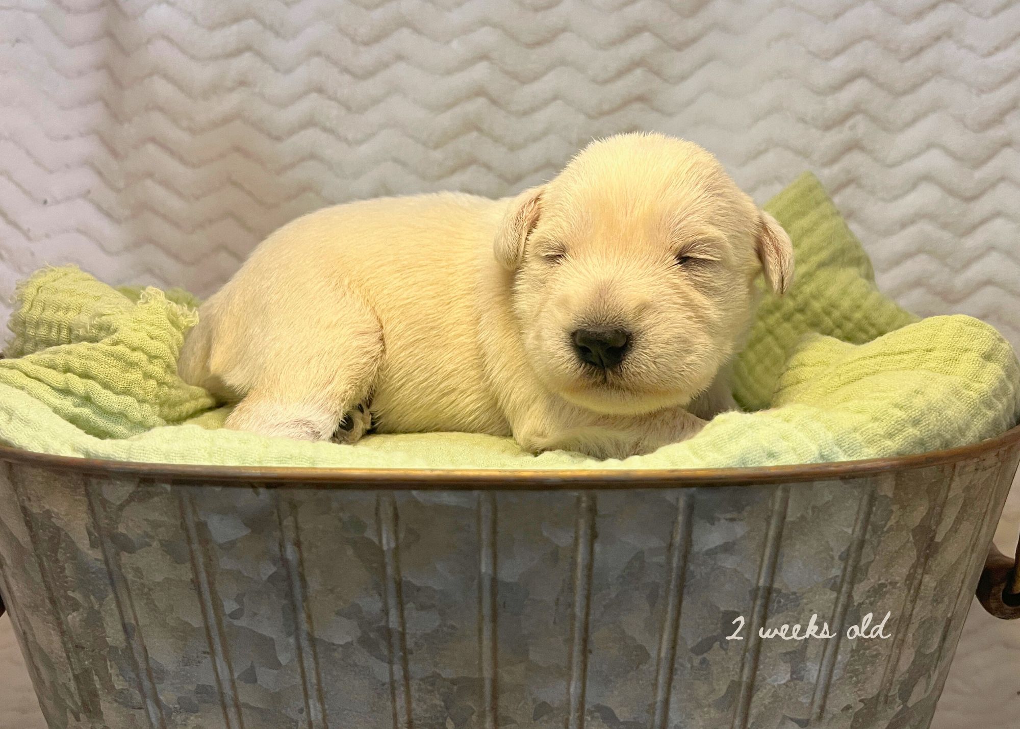 Stella was born on October 4 and she will be ready to go home around December 6, 2025! Her coloring is white and we are expecting the puppies in this litter to be tenderhearted and attentive like Vivie’s previous litters!